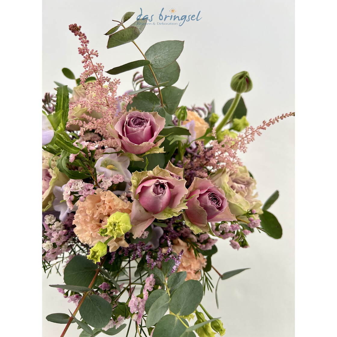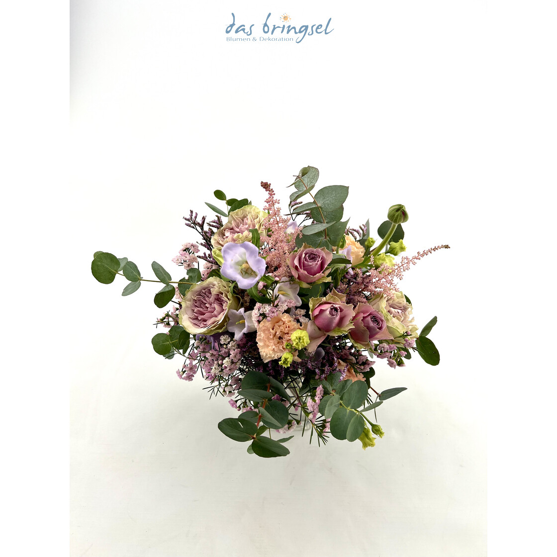 Kompakt gebundener Strauß in zarten Lila- Fliedertönen,